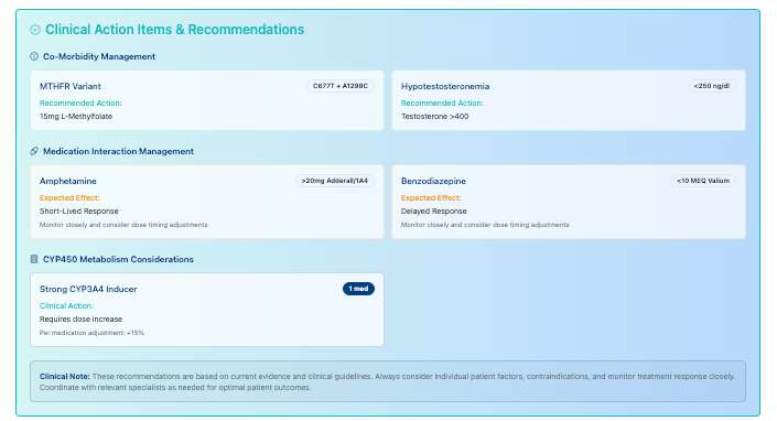 You'll integrate genetic testing results (Genomind interpretation) to identify CYP450 ultra-rapid metabolizers who require dose increases, MTHFR variants that necessitate pre-treatment methylfolate supplementation, and BDNF polymorphisms that predict response patterns.