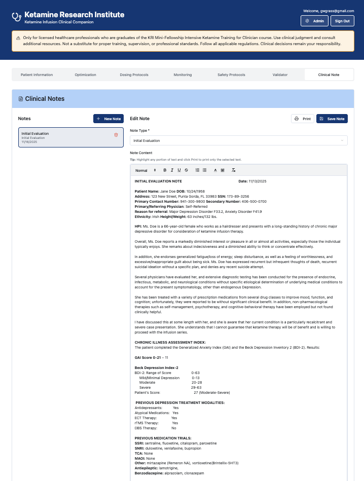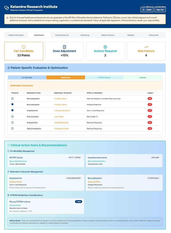 You receive our complete, experience-tested operational system: the proprietary KRI Clinical Companion app with real-time pharmacokinetic dosing calculators, genetic test interpretation guides, and drug interaction algorithms; medico-legally vetted documentation (evaluation templates, DEA-compliant logbooks, informed consent forms, procedural notes, emergency protocols); the Ketamine Evaluation and Optimization Guide with patient-specific dose adjustment tables for MTHFR variants, CYP450 metabolism, and medication interactions; plus comprehensive safety protocols exceeding ASA/APA standards. These aren't PDFs you'll modify—they're proven systems you implement immediately, protecting you legally while delivering precision medicine from your first patient.